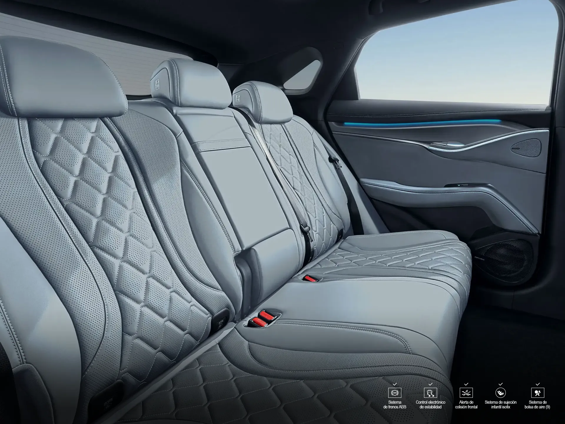 El interior refleja lujo y comodidad con asientos de cuero con calefacción y ventilados para ambas filas. El conductor cuenta con 8 posiciones de ajuste eléctrico y memoria, mientras los pasajeros disfrutan de un espacio amplio y ventilación trasera. La cabina está diseñada en tonos "Thaumas Black", con un ambiente refinado que destaca por su pantalla táctil rotatoria de 15,6 pulgadas.