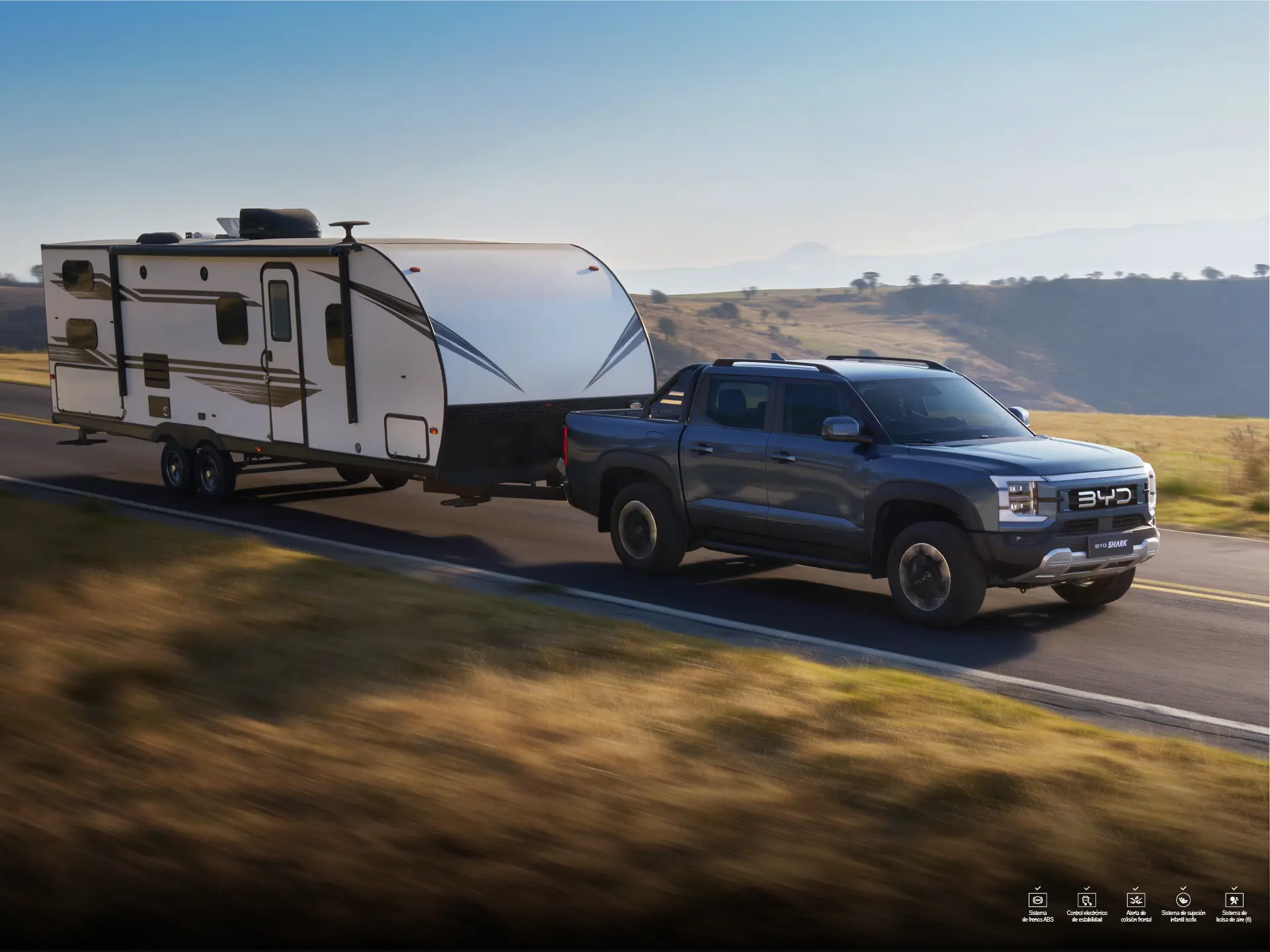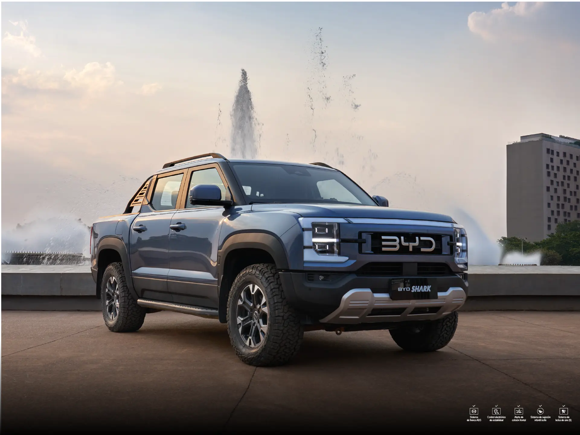 La BYD SHARK DM-O impresiona con un diseño imponente y detalles funcionales: rines bitono de 18”, luces LED delanteras y traseras, estribos laterales, rieles de techo y un platón equipado con protector, escalera de acceso y conexiones de energía (220V/110V).