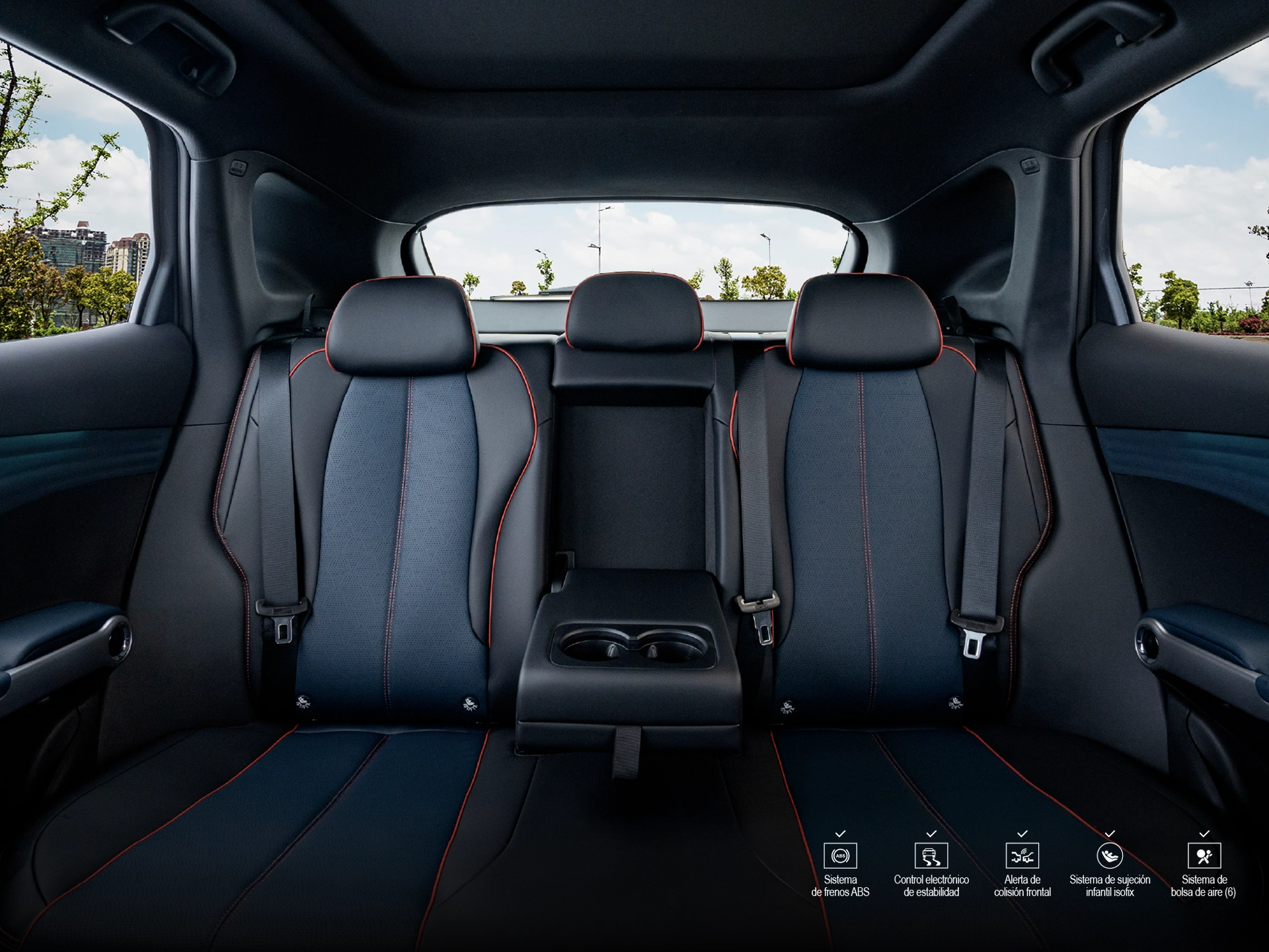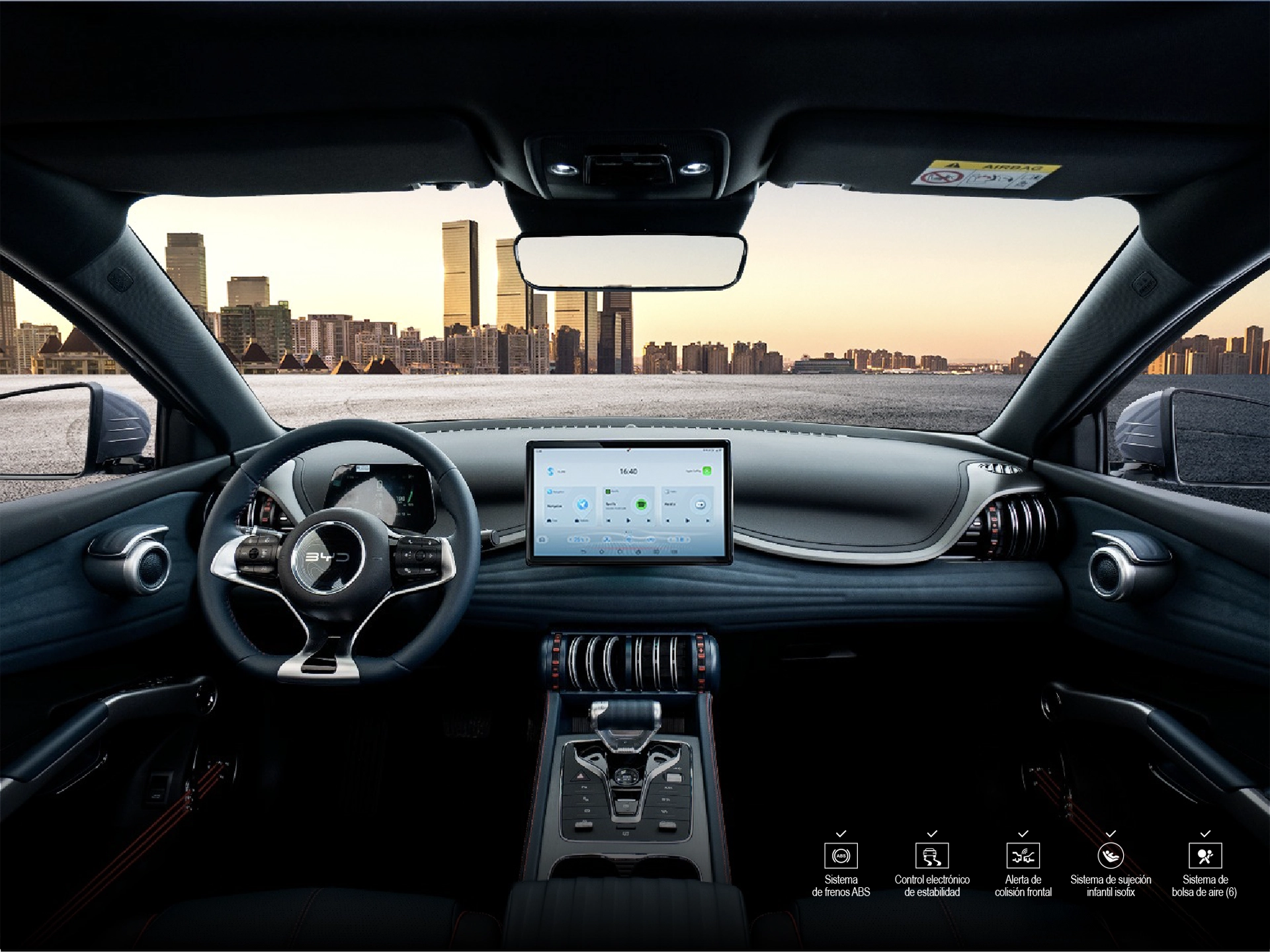 Incluye una pantalla táctil de 12.8'' con rotación eléctrica y conectividad Apple CarPlay/Android Auto, además de un sistema de sonido de 8 parlantes. En seguridad, destaca por ofrecer: